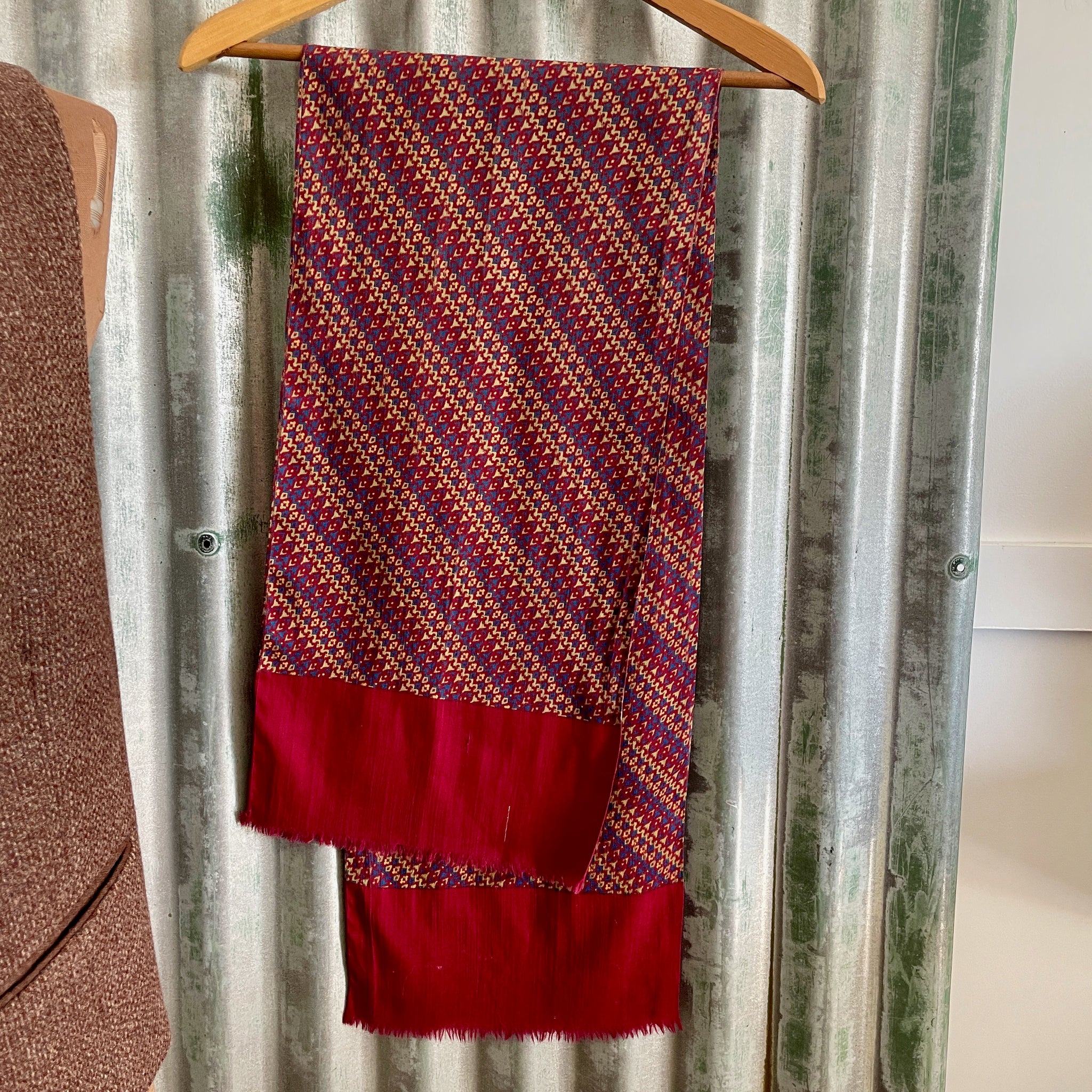 Vintage silk ascot cravat / neck scarf in geometric designs stylishly running in a diagonal pattern. Colours of burgundy, yellow and blue with burgundy edging.