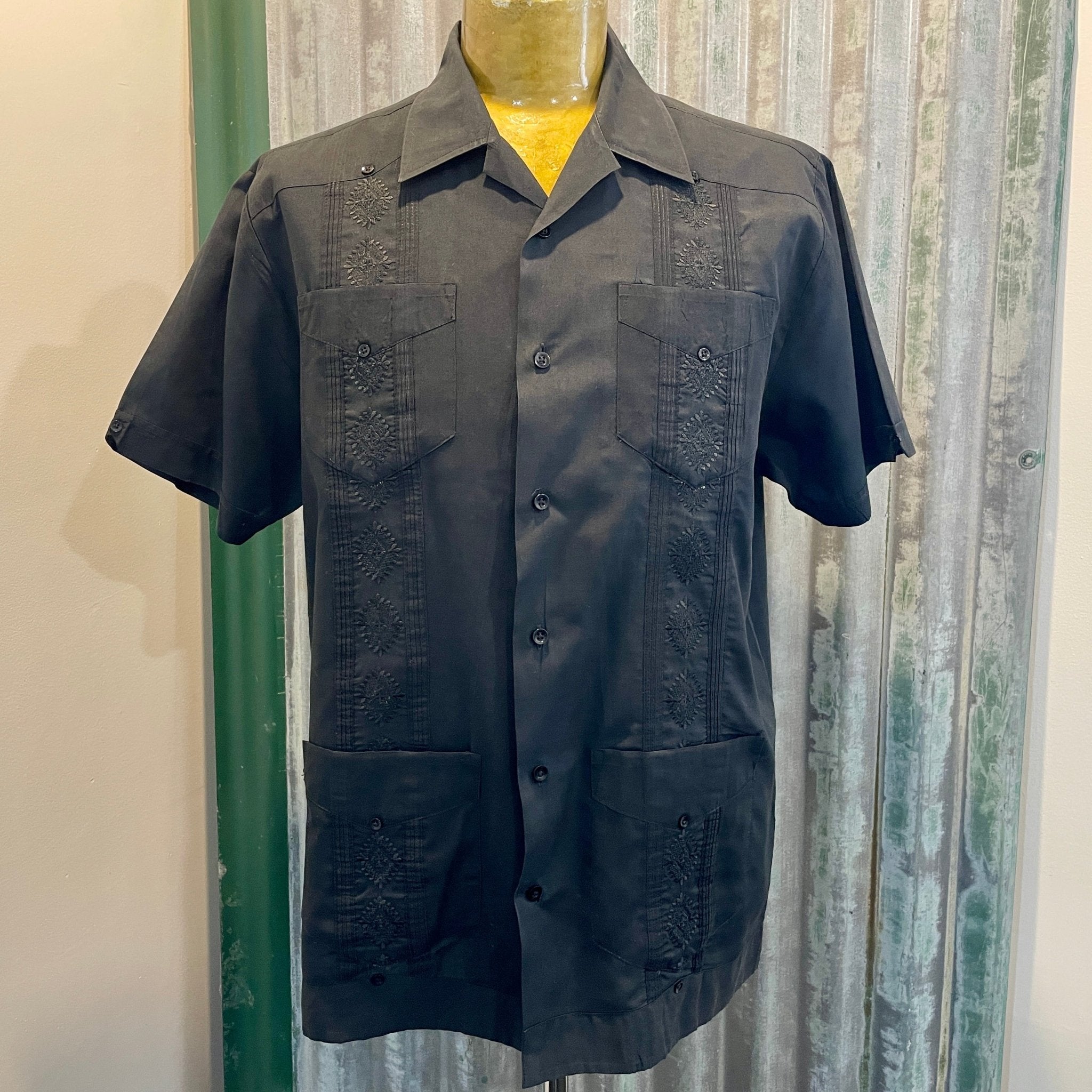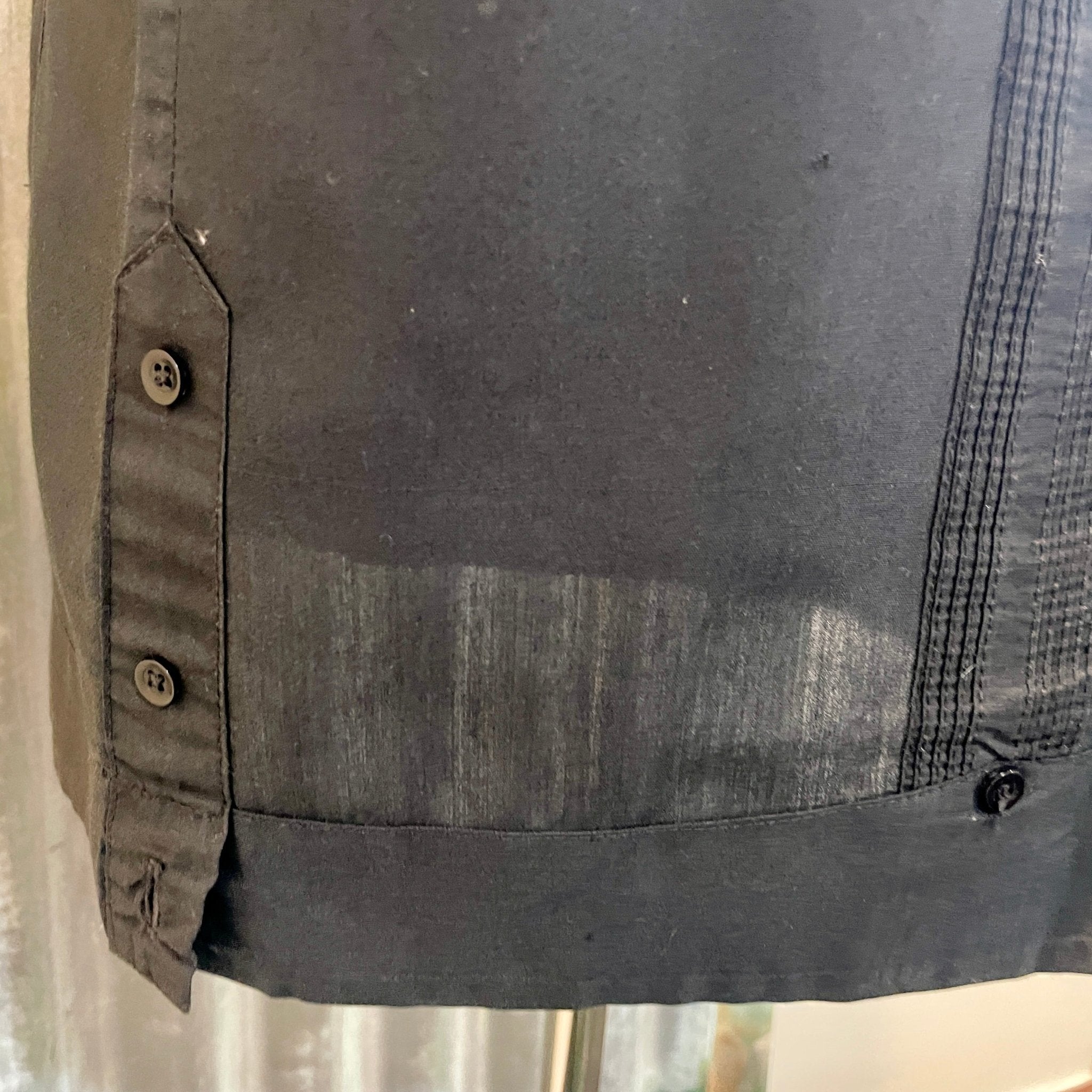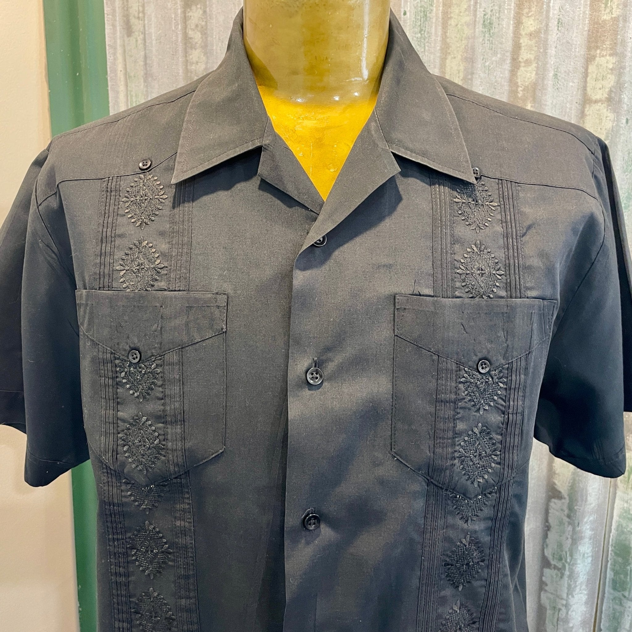 1970's Vintage Men's Guayabera "Wedding Shirt" Charcoal Black S/S Shirt Sz L - OOAK