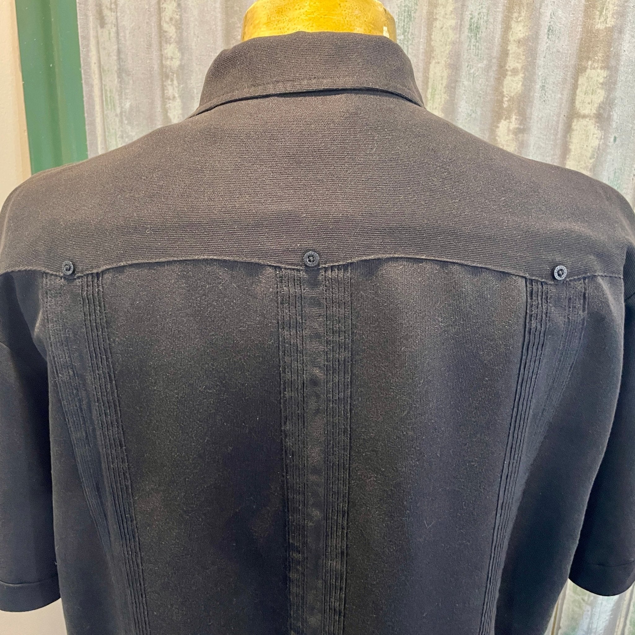 This beautiful charcoal black shirt features vertical rows of alforzas (fine, sewn in pleats) running down the front, which also continues over the pockets and 3 pleats running down the back. A small black decorative button is sewn at the bottom of each pleat.